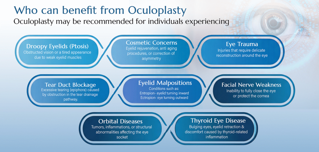 At Anandam Eye Clinic, we offer comprehensive Oculoplasty services—a highly specialized field that blends the precision of ophthalmology with the artistry of facial plastic surgery. Our treatments focus on restoring the function, comfort, and appearance of the eyelids, tear drainage system, eye socket (orbit), and surrounding facial structures.