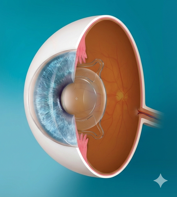 ICL is a soft, flexible lens that’s gently placed inside your eye, behind the iris and in front of your natural lens. It works with your eye to correct nearsightedness, farsightedness, or astigmatism—without reshaping the cornea, as in LASIK.
